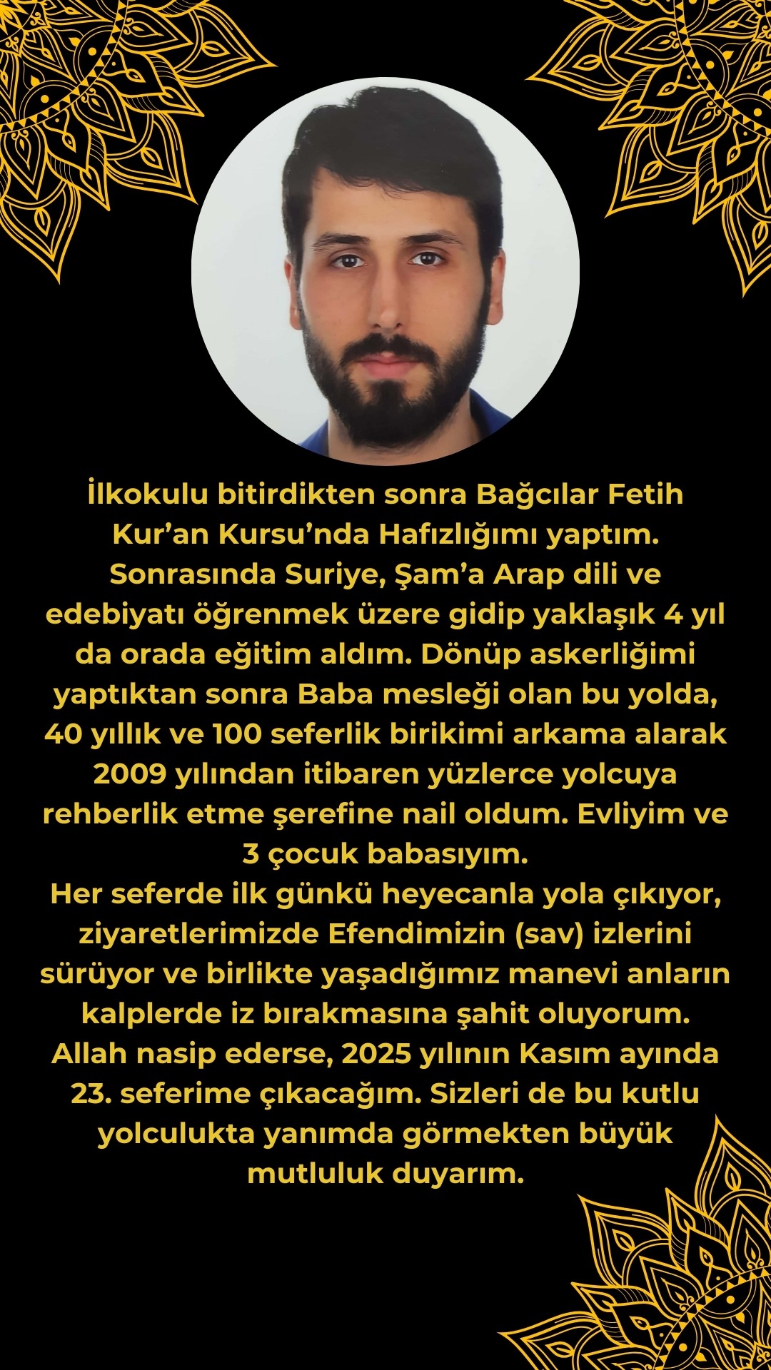Baba mesleği olan bu yolda, 40 yıllık ve 100 seferlik birikimi de arkama alarak 2009 yılından itibaren 6 hac ve 16 umre programının başında bulunarak yüzlerce din kardeşime toplamda 22 sefer ile rehberlik etme şerefine nail oldum.