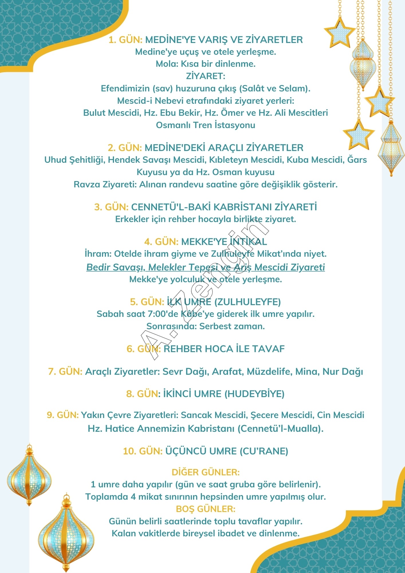 Her gün en az bir etkinlikle, Efendimiz’in (s.a.v.) Mekke ve Medine’deki izlerini takip ederek dolu dolu bir SİYER Umresi yapıyoruz.